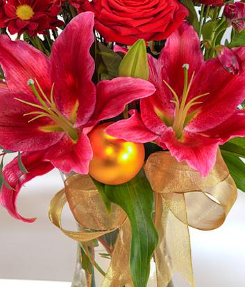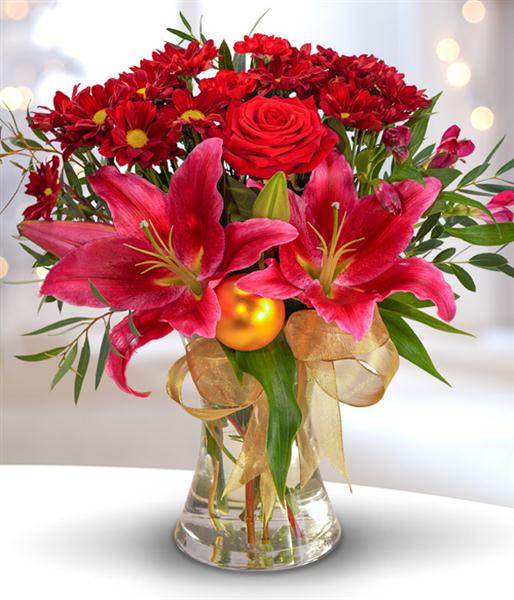 Celebrate the joy of the season with our Traditional Christmas bouquet! This stunning arrangement features vibrant red Roses, cheerful Chrysanthemums, classic Carnations and elegant pink Lilies, complemented by luscious cerise Alstromeria. Finished with a beautiful gold bauble, this eye-catching bouquet is the perfect gift to spread festive cheer. Ideal for sharing love and warmth during the holidays, it promises to delight your loved ones. Order this exquisite Christmas bouquet today and make this holiday unforgettable!