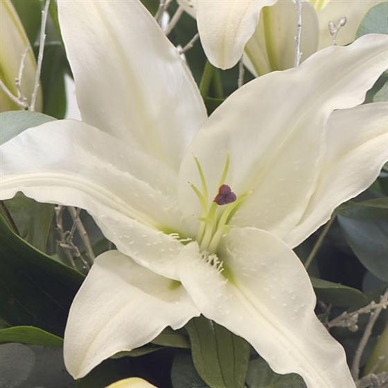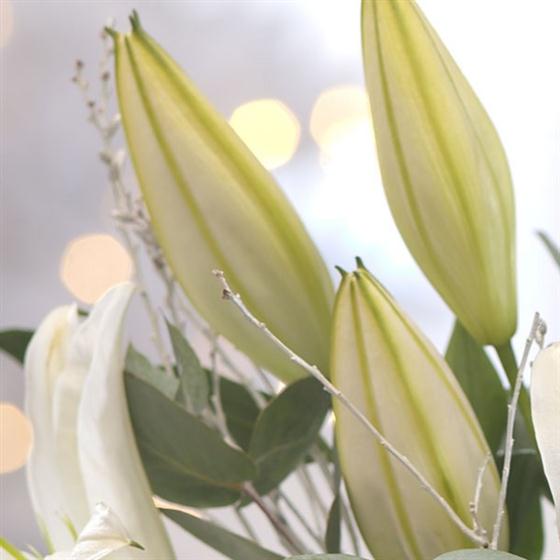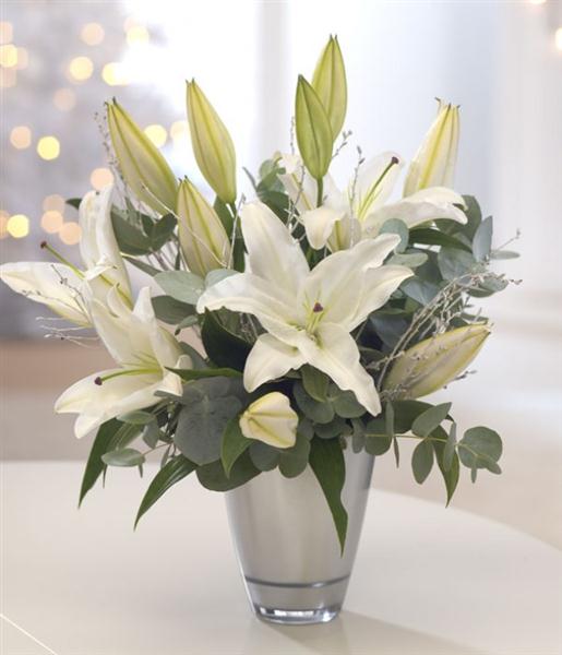 Fresh, crisp white Lilies presented in a silver vase make this a striking Christmas flower gift.