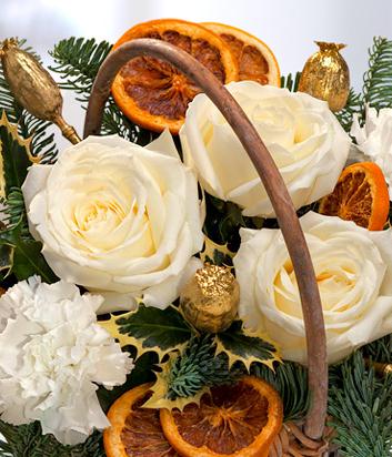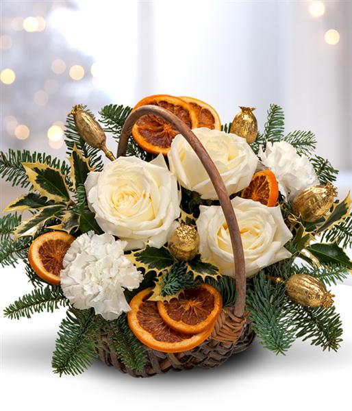 Introducing our enchanting Christmas Wish Basket Display, a perfect holiday centerpiece! This stunning arrangement features elegant white roses and vibrant carnations, beautifully complemented by festive holly and blue spruce. To add a touch of charm, we've included luxurious gold-dried accents and a delightful sprinkling of dried orange slices, creating a warm and inviting atmosphere. Ideal for gifting or as a seasonal decoration, this exquisite flower basket brings holiday cheer and elegance to any home. Order now to spread the joy this Christmas!