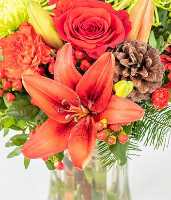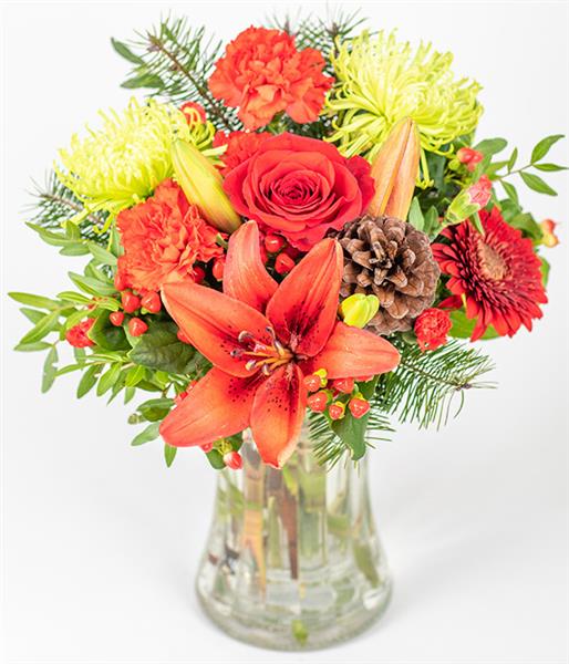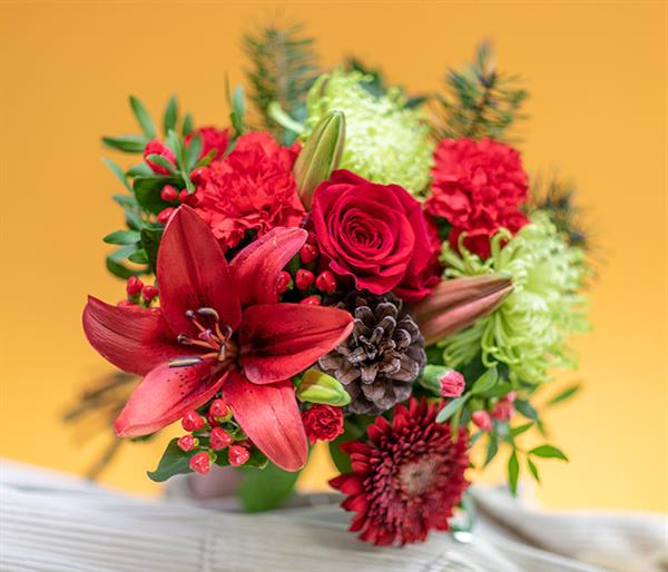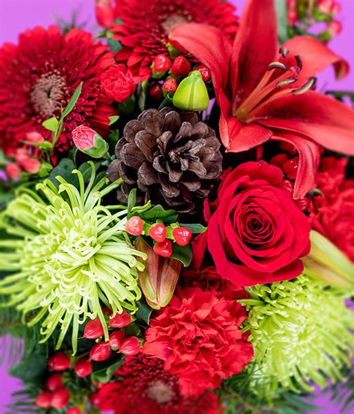 Elevate your holiday celebrations with our Classic Christmas Handtied Bouquet. This stunning festive arrangement features a vibrant mix of red lilies, cheerful carnations, lush green bloom chrysanthemums, and delicate germini, all accented with charming pinecones and fragrant seasonal foliage. Perfect for gifting or decorating your space, this bouquet is designed to bring warmth and joy to any home. Order now from Rays Florist for timely delivery and make this Christmas truly special! Experience the magic of the season with our exquisite flower arrangements today.
