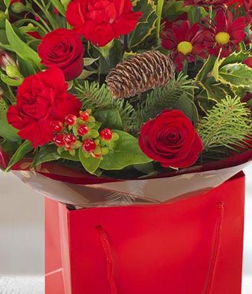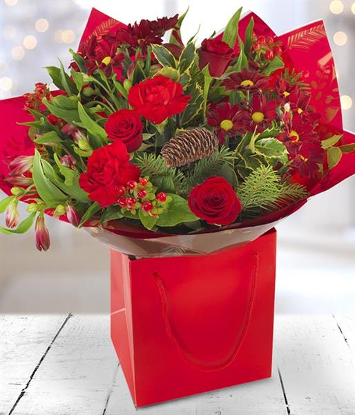 Cosy Christmas flower bouquet arranged with festive seasonal blooms, rich winter colours, and soft textured foliage. Styled to bring warmth and Christmas charm to any home. Ideal as a thoughtful seasonal gift and available for reliable local delivery throughout Aldershot and the GU postcode area, making it easy to share festive cheer.