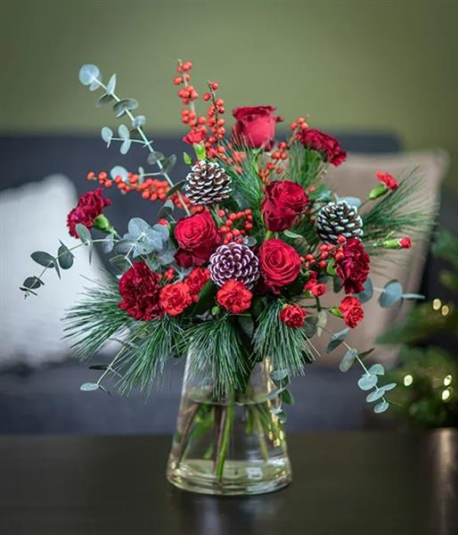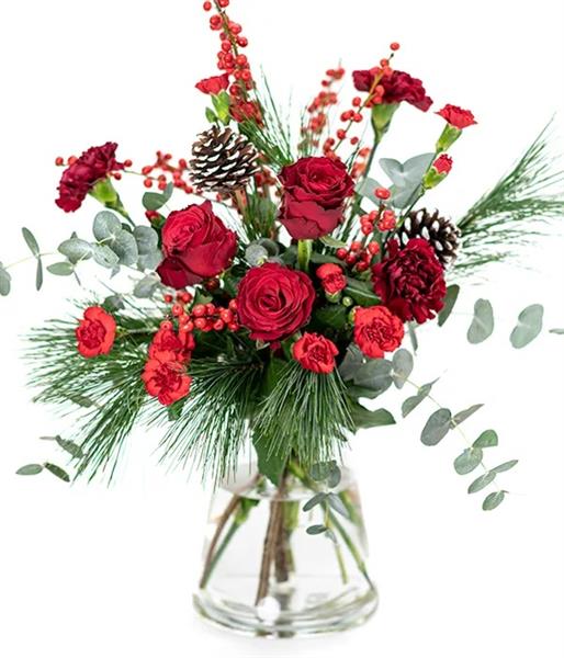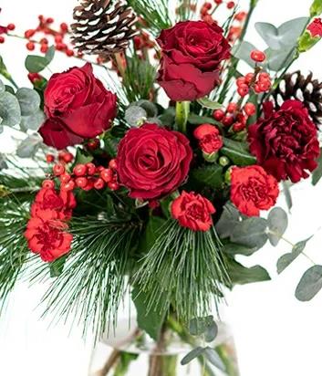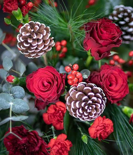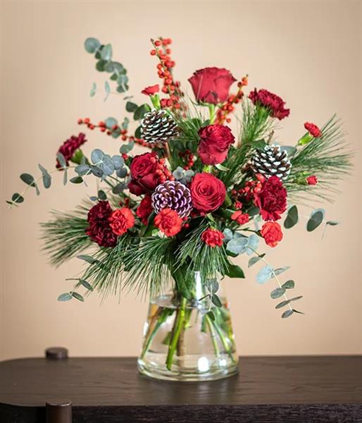 Experience the magic of the season with our Crimson Christmas bouquet. This stunning arrangement features lush deep red roses, festive pine cones, elegant eucalyptus, vibrant red carnations and decorative Ilex. Each hand-tied bouquet is crafted with care by our skilled florists and hand-delivered to brighten your loved one's holiday. Perfect for spreading festive cheer and making unforgettable memories, the Crimson Christmas bouquet is the ideal gift for anyone on your list this holiday season. Order now to share the joy!