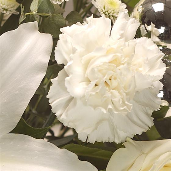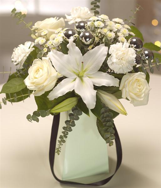 A pure white Lily is the star of this incredibly elegant flower gift bag. White Roses, Spray Chrysanthemum and Carnations, married with silver baubles perfect this beautiful Christmas gift.