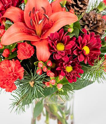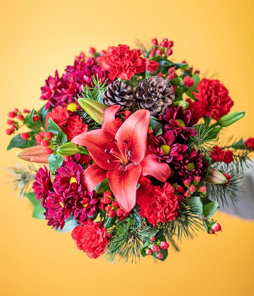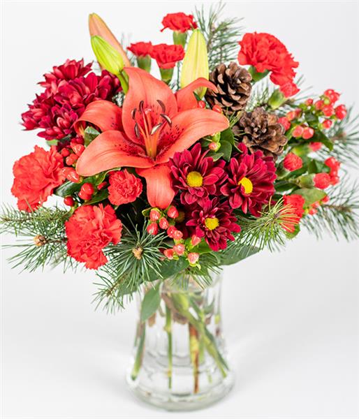 Introducing our exquisite hand-tied Christmas bouquet, featuring vibrant red lilies, fragrant carnations, cheerful chrysanthemums and lush hypericum berries. Enhanced with charming pinecones, fresh spruce and seasonal foliage, this arrangement is a stunning gift for the festive season. Delivered directly by Rays Florist, it's the perfect way to spread holiday cheer. Surprise loved ones with this beautiful festive gift that captures the essence of Christmas. Order now to ensure timely delivery for your special celebrations!