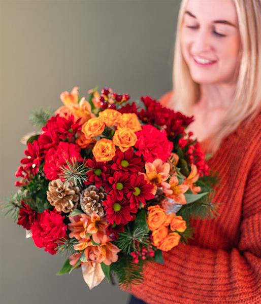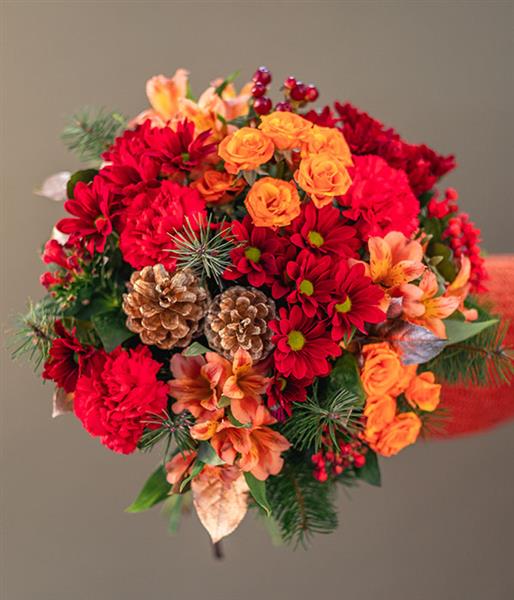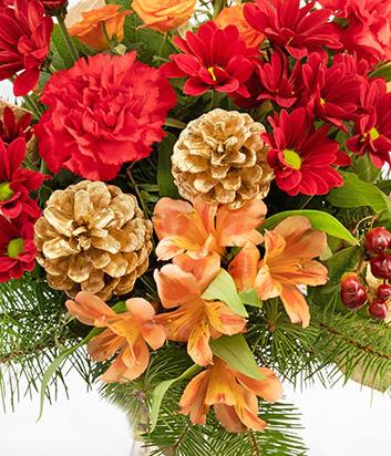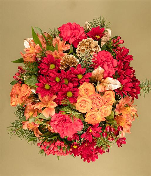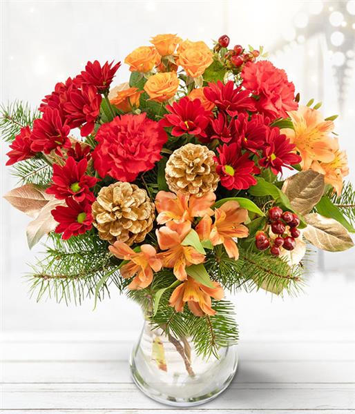 Introducing the Mulled Wine Aqua Bouquet, a stunning and festive floral arrangement perfect for your holiday decor. Featuring vibrant red chrysanthemums, cheerful orange alstroemeria, and charming spray roses interspersed with lush carnations, this bouquet captures the spirit of the season. Adorned with fragrant pine, shimmering gold leaves and rustic pinecones, it adds warmth and elegance to any home. Ideal for seasonal celebrations or as a thoughtful gift, the Mulled Wine Aqua Bouquet creates festive cheer throughout your living space. Order yours today for a touch of holiday magic!