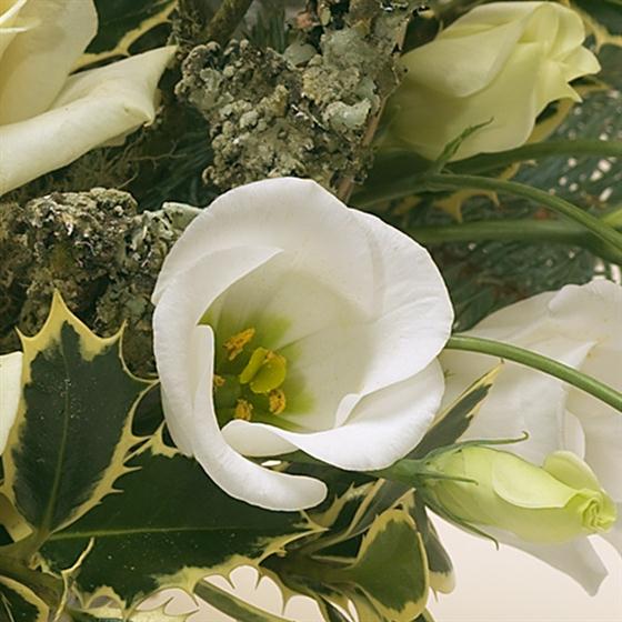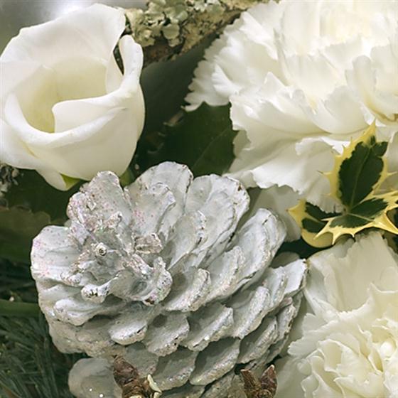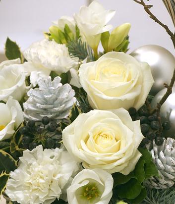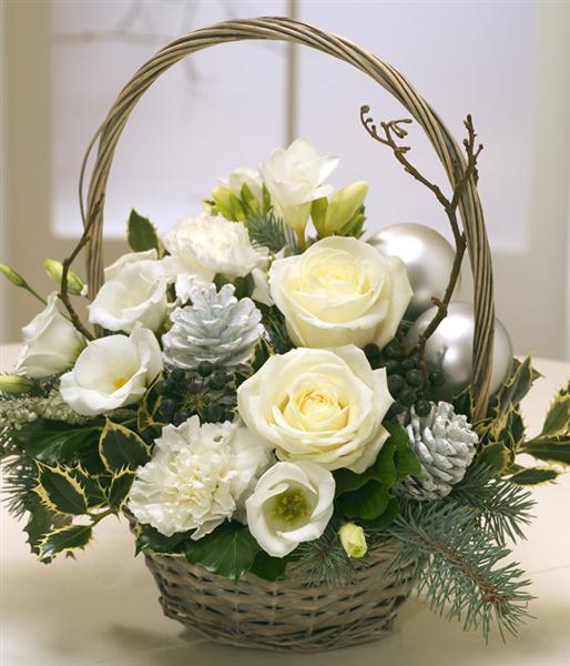A beautiful Christmas flower basket comprising of cream Roses, white Freesias, Lisianthus and Carnations. Pine Cones and Holly sprigs complete the arrangement.