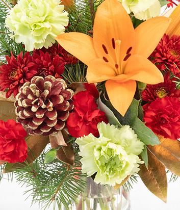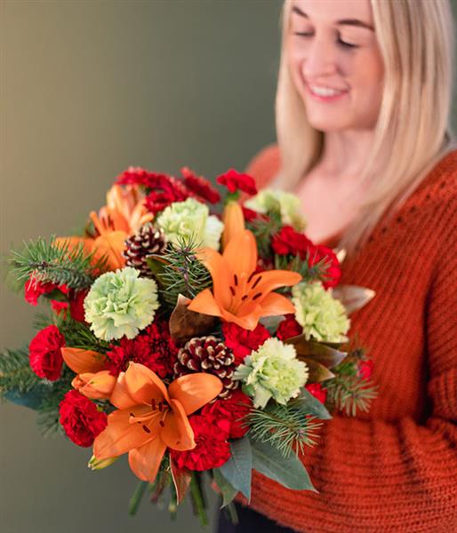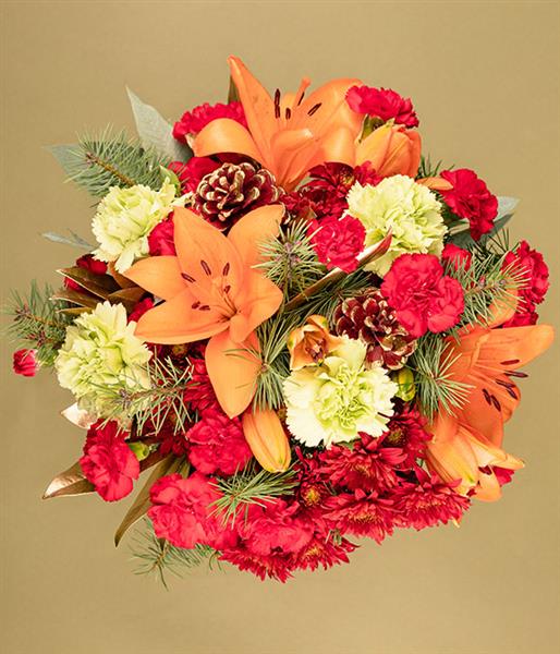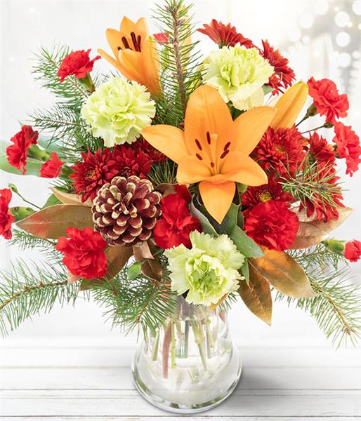 The Nutcracker Bouquet features a vibrant arrangement of orange lilies, spray roses, red chrysanthemums and green carnations, beautifully complemented by festive gold and green foliage. This stunning bouquet captures the essence of Christmas with its rich colours, making it the perfect holiday gift or decoration for any festive occasion. Delivered in water to ensure freshness, the Nutcracker Bouquet brings joy and warmth to every celebration. Surprise your loved ones this season with this exquisite floral display that embodies holiday cheer.