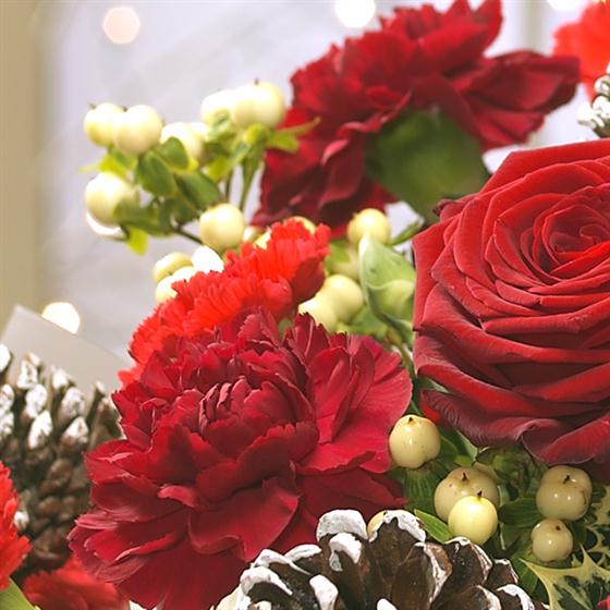 Discover the perfect Christmas flower gift with our "Tinsel Town" arrangement. This enchanting bouquet features lush red velvety Carnations paired elegantly with creamy white Spray Chrysanthemums, creating a stunning contrast. Accented by frosted white Pine Cones, this seasonal centrepiece brings warmth and holiday cheer to any home. Ideal for gifting or decorating, "Tinsel Town" embodies the spirit of Christmas with its rich colours and festive charm. Share joy this season with this beautiful floral arrangement that captures the essence of the holidays.