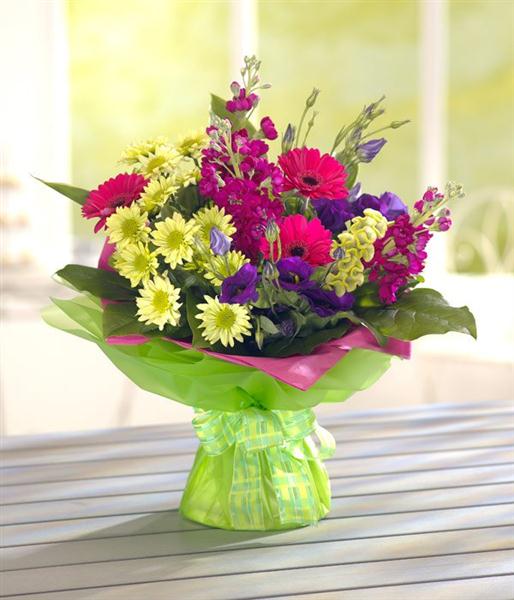 Experience the joy of summer with our Alfresco Handtied Bouquet. Bursting with vibrant gerberas, lisianthus and chrysanthemums in cerise and lime hues, this bouquet is perfect for any occasion. Each arrangement is expertly crafted with fresh flowers to ensure longevity in your home. Ideal for gifts or personal enjoyment, our bouquets are delivered directly in water for your convenience. Order now to brighten your day!
