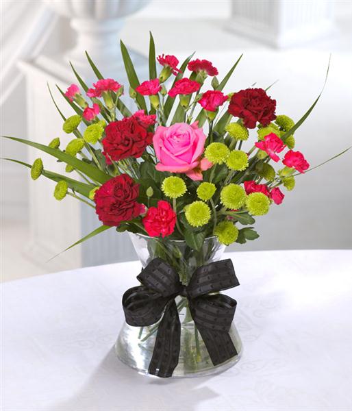 Romantic red Carnations and pretty cerise pink Spray Carnations combine with contrasting lime Santini Chrysanthemum. A light pink Rose steals the show in this traditional bouquet.