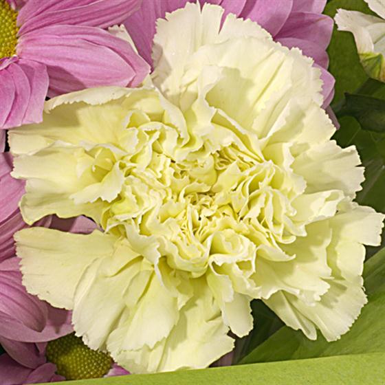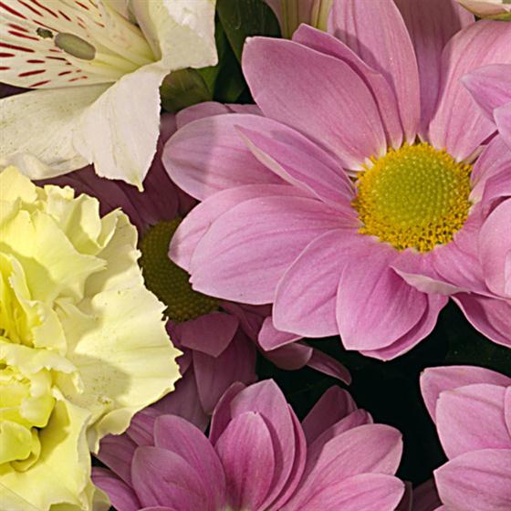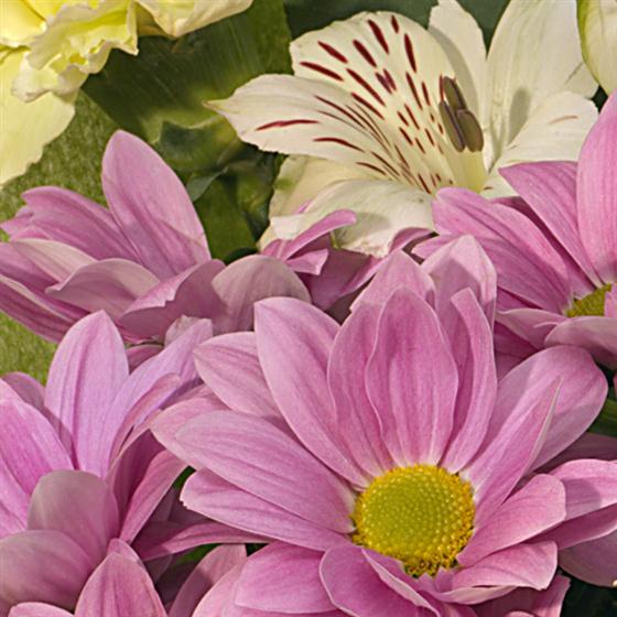 A delicious mix of pink Chrysanthemums, yellow Carnations, white Alstroemeria and white Roses.