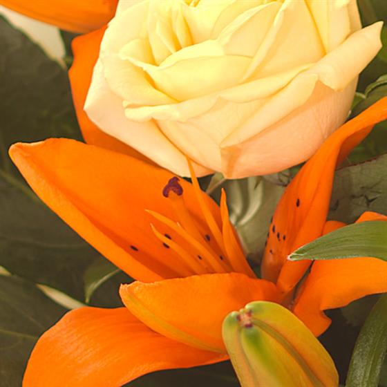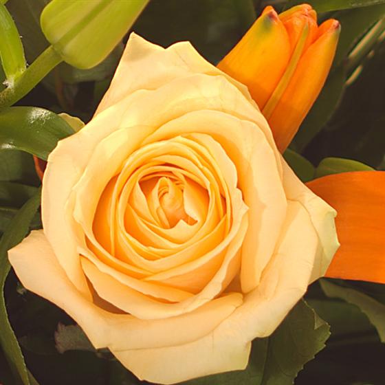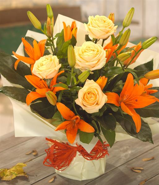 Warm peach roses and rich orange lilies come together in the Autumn Rose and Lily bouquet—an elegant, aqua-packed arrangement delivered in water by your local florist. Perfectly balanced for both home display and heartfelt gifting, this bouquet blooms beautifully over time. Available in six sizes—from Standard to Out of This World—add chocolates, balloons, or a vase to personalise your gift. Same/next-day delivery across most GU postcodes ensures convenience and freshness.