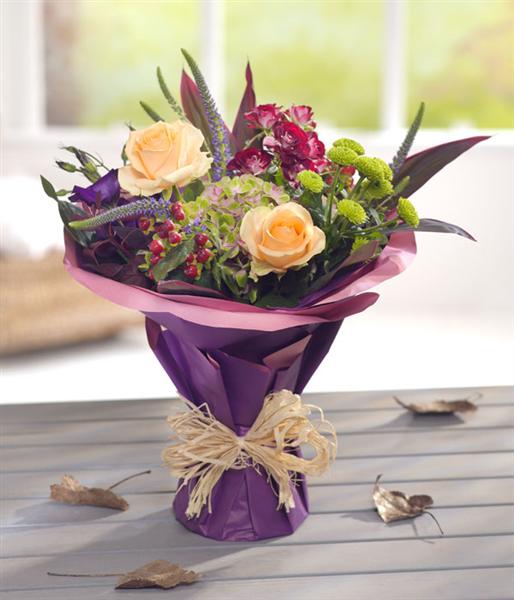 Capture the essence of autumn with our Autumn Vibrance Hand-Tied Bouquet—a luxurious blend of velvety purples, creams, and pinks featuring roses, hydrangea, lisianthus, chrysanthemum, and veronica. Aqua-packed for freshness and hand-delivered across GU postcodes by your local florist. Choose from five sizes (£39.99–£99.99) and add a vase at checkout.