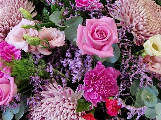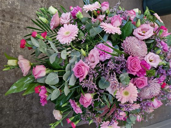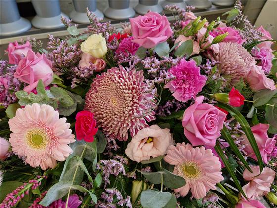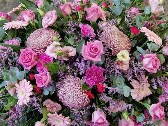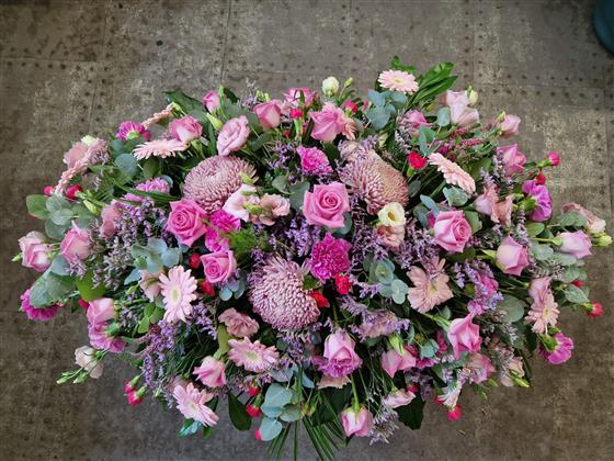 Soft shades of a multitude of pink shades make this casket spray suitable for a lady. This coffin spray is made from an array of fresh seasonal flowers which may include roses, gerberas, lisianthus, chrysanthemum blooms, carnations, asters and complementary fresh green foliage's.