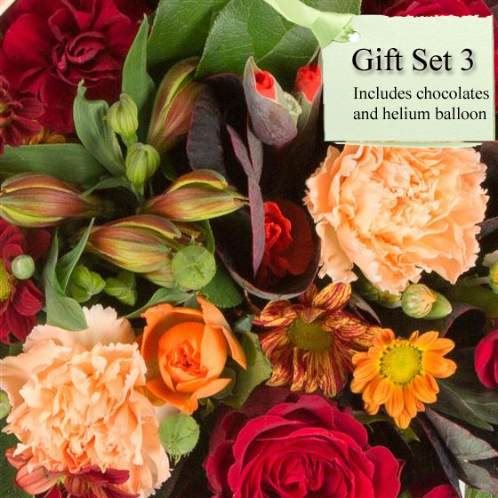 Unsure what to flowers send? Simply select a colour theme and price and we will prepare a stylish arrangement of flowers to suit the occasion in a glass vase complemented with a box of milk chocolates and a helium foil balloon.