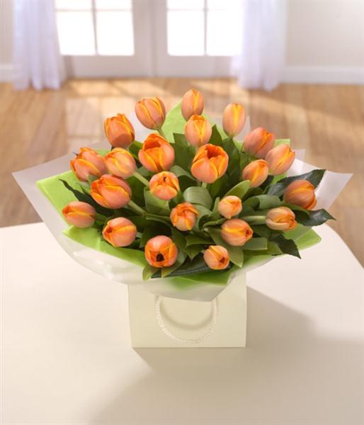 Brighten someone's day with our stunning Glowing Orange Tulips, elegantly presented in a chic cream gift bag. Perfect for any occasion, these vibrant tulips are sure to bring joy and warmth to your loved ones. Our premium quality blooms are hand-selected for their freshness and beauty, making them an ideal gift for birthdays, anniversaries, or as a delightful surprise. Order now to experience the uplifting cheer of these radiant flowers, beautifully packaged and ready to delight!