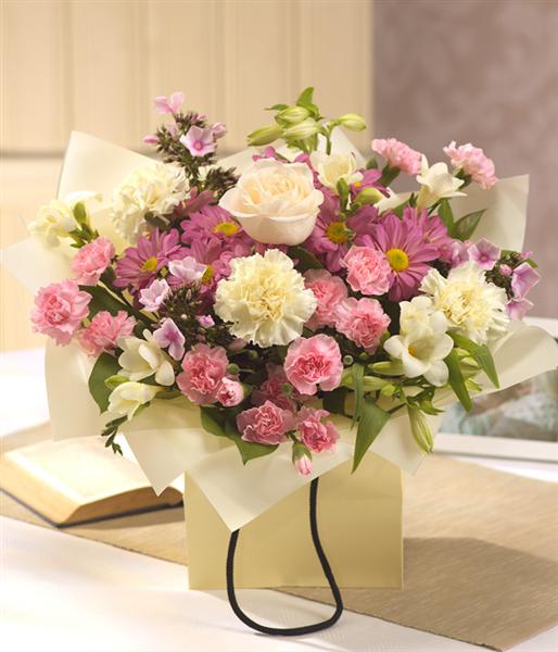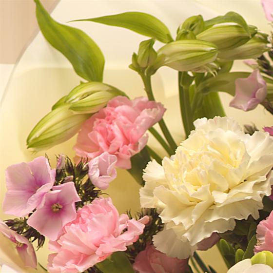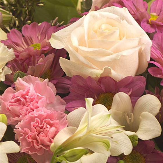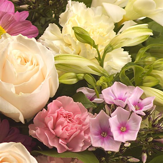 A soft, creamy and scented hand-tied bouquet, aqua packed for freshness featuring Roses, Freesia, Phlox, Alstroemeria and Chrysanthemums.