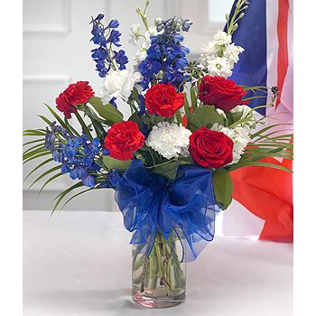 A stunning and colourful red, white and blue aqua packed flower bouquet. The striking blue Delphiniums married with white Stocks and red Roses are perfectly combined with Cane Palm leaves to create a bouquet worthy of the podium itself.