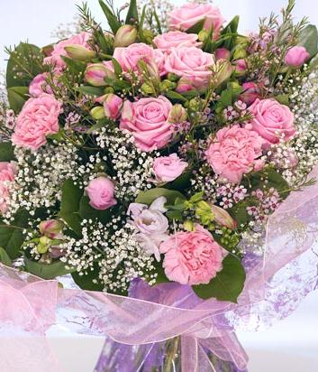 A beautifully pretty hand-tied bouquet of mixed pink flowers including pink Roses, Alstromeria, Carnations and Gypsophilia. Pastel packaging complement the flowers which are supplied in an aquapack for instant display.