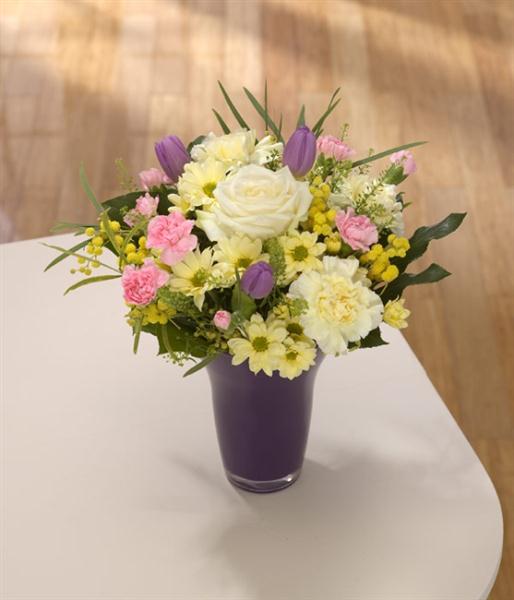 Brighten your space with our stunning pastel vase arrangement, capturing the essence of Spring. This delightful floral display features vibrant Lavender Tulips, elegant cream Roses, soothing pale blue Hyacinths and charming pink spray Carnations. Perfect for adding a touch of colour to any room or for gifting to loved ones on special occasions. Enhance your home decor or celebrate a cherished moment with these soft-hued blooms. Shop now to bring the beauty of spring indoors and elevate your floral experience!