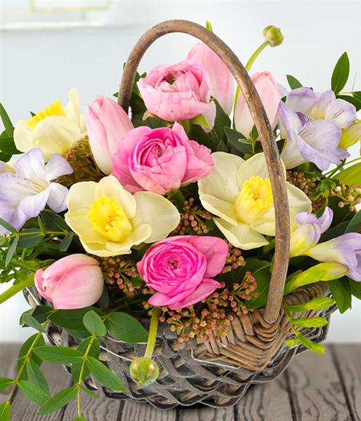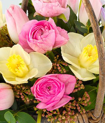 Experience the beauty of spring with our Pretty Spring Basket, a delightful arrangement filled with vibrant seasonal blooms. This stunning basket features charming pink Ranunculus, fragrant lavender Freesia, cheerful pink Tulips, bright Daffodils and fresh Viburnum, beautifully complemented by Eucalyptus for a refreshing aroma. Ideal for any occasion, this spring floral arrangement brings joy and colour to your space. Please note, as the season advances, Daffodils may be substituted to ensure the freshest selection.