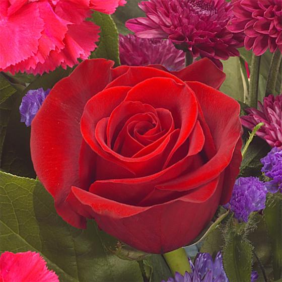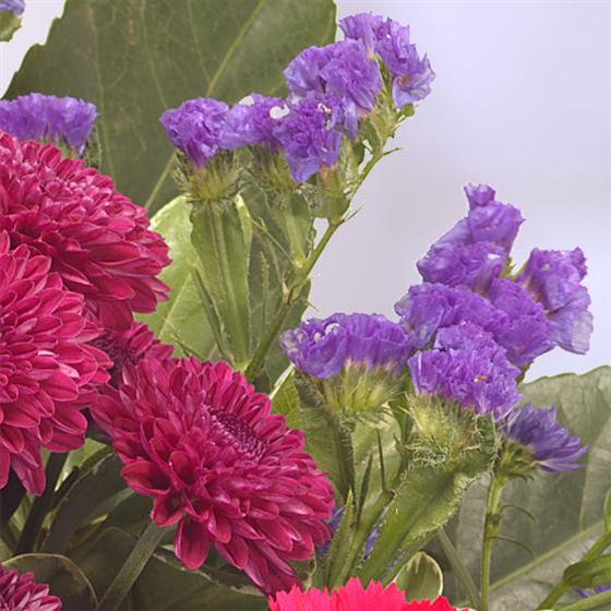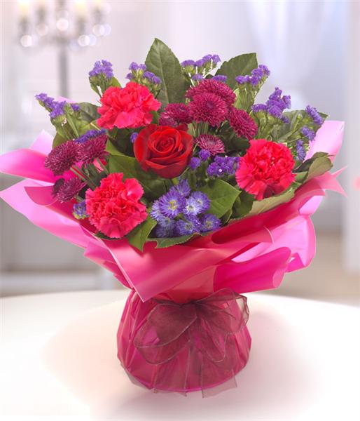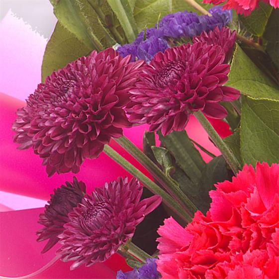 Experience the vibrant beauty of the Pure Passion hand-tied bouquet, elegantly delivered in water to ensure maximum freshness. This stunning arrangement features rich hues of red, purple, and cerise, blending the romantic red rose, cheerful carnation, delicate chrysanthemum, seasonal September flower and statice. Perfect for any occasion, this bouquet not only brightens spaces but also conveys heartfelt emotions. Order now for a dazzling floral gift that captures passion and joy, making every moment memorable.