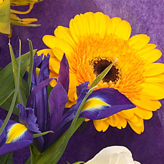 Delightful Raindrops bouquet! Yellow Alstroemeria and Germini blend with blue Iris and white Chrysanthemums. Eucalyptus completes this bold yet delicate arrangement. Available in various sizes. Order online for local delivery from Rays Florist!