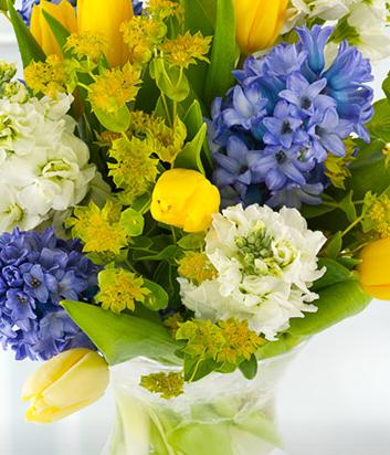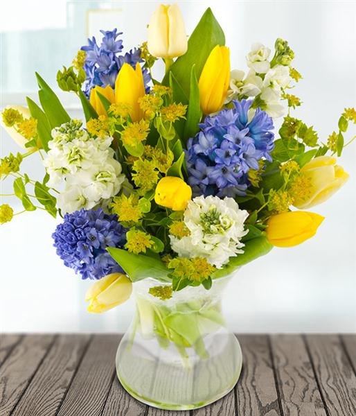 Brighten someone's day with our Shades of Spring bouquet at Rays Florist. This beautiful arrangement features vibrant blue Hyacinths, pure white Stock and cheerful cream and yellow Tulips, all adorned with luxurious Bupleurum. Each bouquet is hand-crafted with care and delivered fresh in bud to ensure longevity. Perfect for celebrating the season or expressing heartfelt sentiments, this floral delight is an ideal gift for any occasion. Experience local expertise and quality with every bloom.