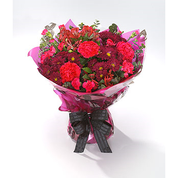 A bold hand-tied aqua-pack bursting with deep red Chrysanthemums and Carnations. A perfect gift for someone. Translation from Italian: 'I Think of You Always'.