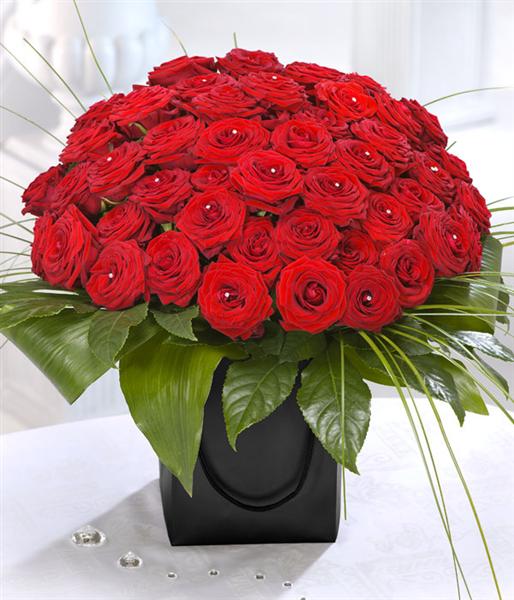 We will create the bouquet with at least 50 large headed, rich, velvety 'Red Naomi' red Roses with a sprinkling of diamante sparkle. Hand tied in water with tropical, lush foliages as the perfect frame.