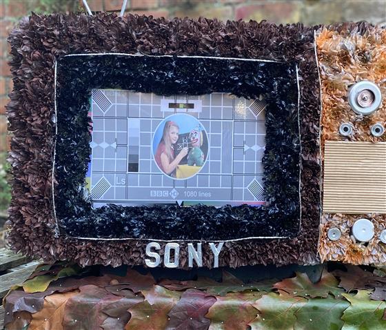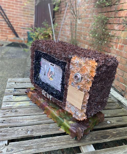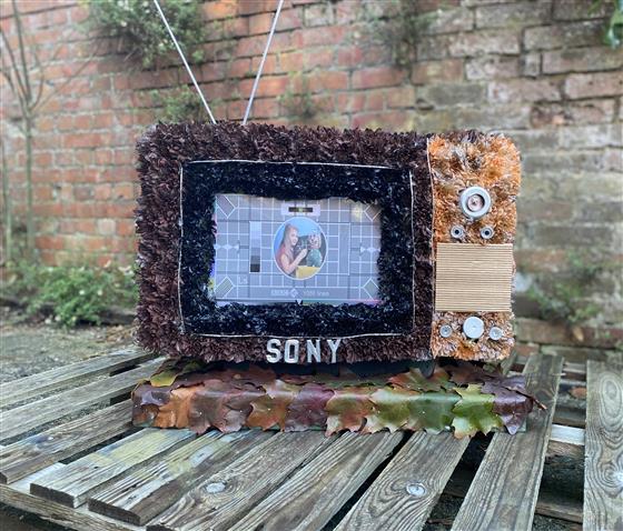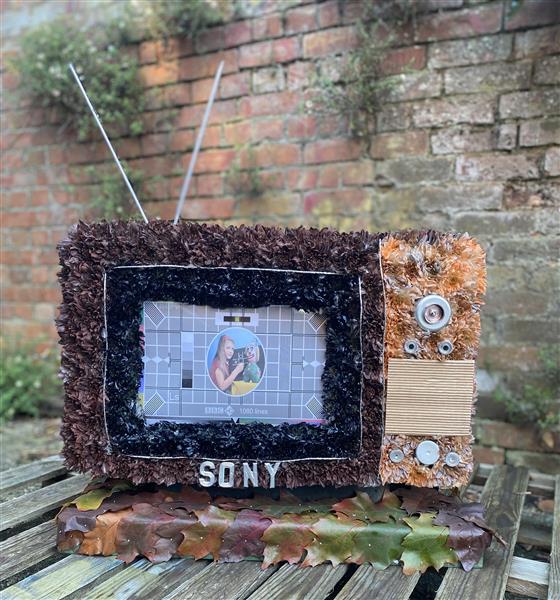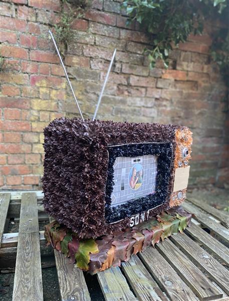 We designed this tribute for someone who loved to tinker with old TV's. Complete with tuning dial and control sliders this would have been the envy of the street in its day. Details have been added such as hand plaited wire to edge the screen, manufacturers name and silver aerials.