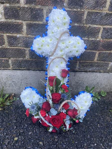 A white Chrysanthemum based anchor tribute with a spray of Roses and a ribbon trim.