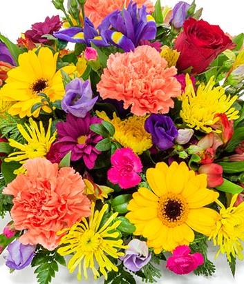 Bright and vibrant posy design, arranged by our professional florist team. Containing a stunning mix of flowers with deep red roses, yellow Germini and chrysanthemums, orange carnations and alstromeria and cerise spray carnations. Flowers arranged using Oasis foam in a posy dish.
