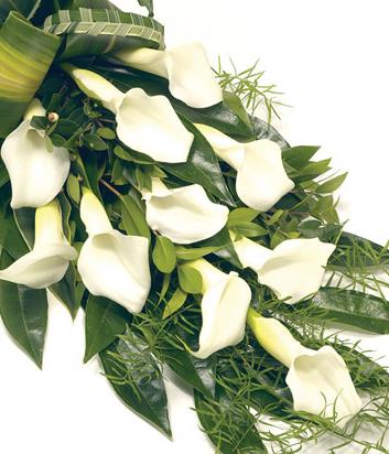 A classic and natural sheaf of Calla Lilies and complementary foliage tied with a natural bow.