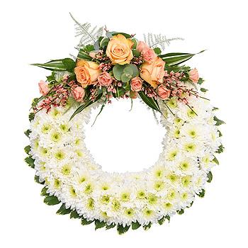 A classic white Chrysanthemum based wreath with peach and pink Roses in the spray.