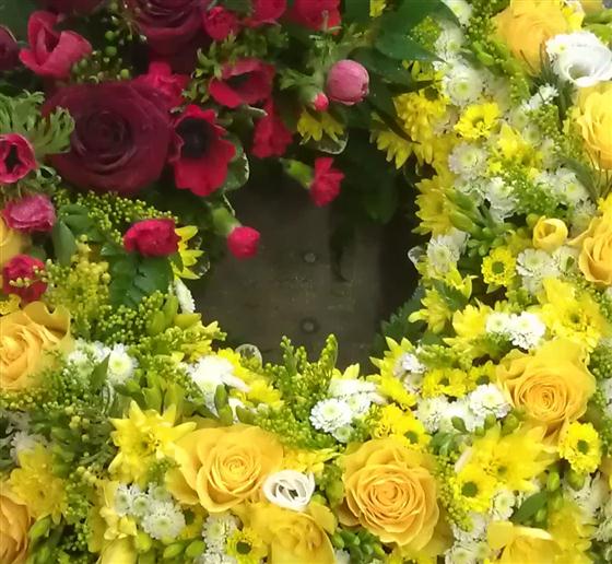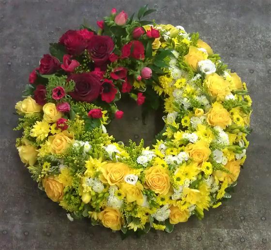 The Compact Section Wreath offers a beautifully full, circular tribute arranged with a variety of flowers in your choice of colours. With an alternative coloured section for contrast fading into the wreath, this design symbolises unity and connection—perfect from family and friends alike. Available in 14″, 16″ or 18″ sizes, delivered locally across most GU postcodes by Rays Florist. Please order at least 3 working days ahead to allow time for selection and preparation.