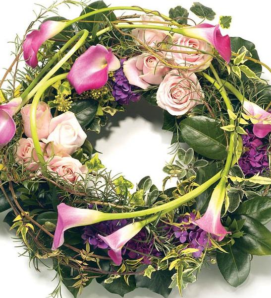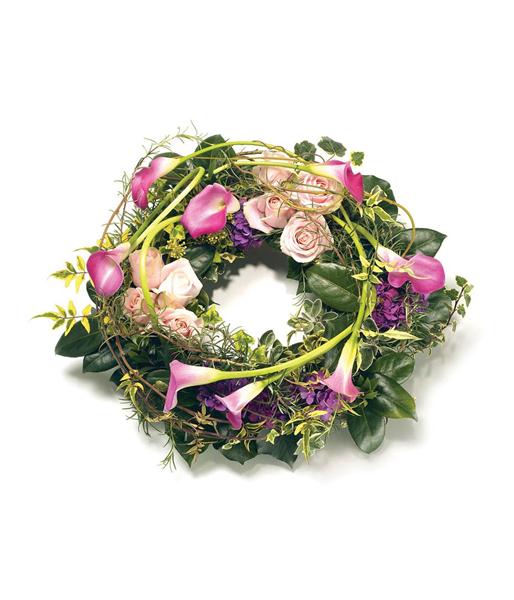 Stunning open round wreath in shades of pink and purple, including Calla Lilies, Roses, Hydrangea and complementary foliage.