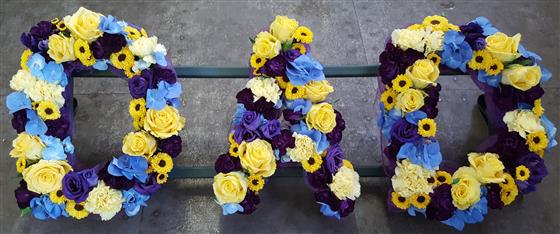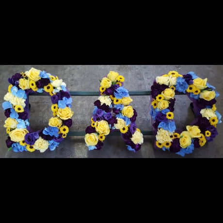 Our DAD Funeral Tribute in Blue, Purple & Lemon is a heartfelt floral display, carefully designed to bring comfort and remembrance. With soft lemon tones balanced by striking blue and purple flowers, this lettered tribute is both personal and dignified. Each design is created with premium blooms by skilled florists. Rays Florist deliver bespoke funeral tributes across most GU postcodes.
