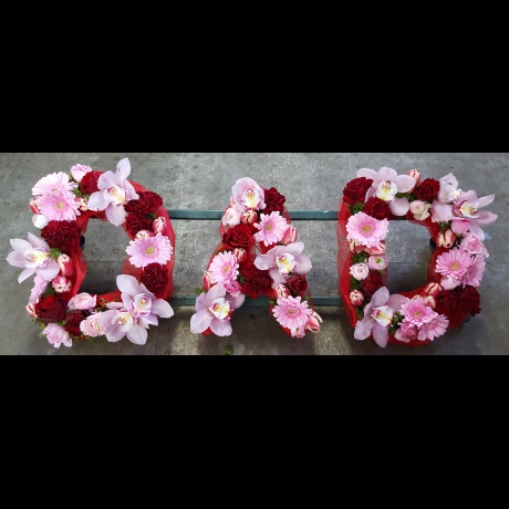 This DAD lettering tribute has been created using pink Cymbidium Orchid, pink Germini, Burgundy Spray Carnation, Roses and other seasonal flowers. These funeral flowers are edged in a soft organza fabric in a colour to match the flowers. The flowers in the tribute will vary due to the season.