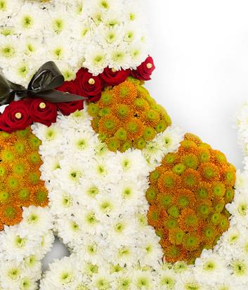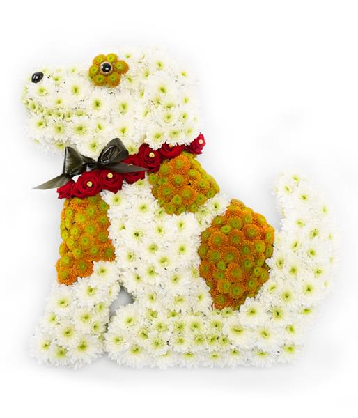 An adorable sitting dog tribute. White and bronze Chrysanthemums form the base of this design which is perfectly finished with a Rose collar. Tribute includes Roses, White Spray Chrysanthemum, Bronze Spray Chrysanthemum & Green Hypericum.