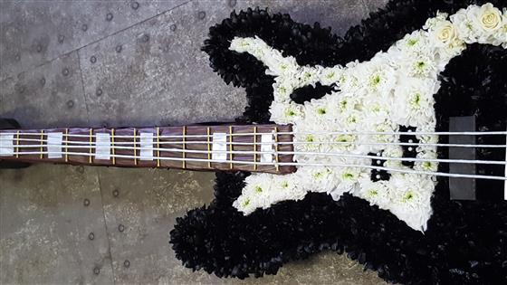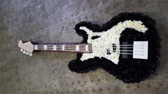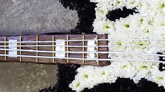 The Fender Bass Guitar Funeral Tribute is a striking homage for the music lover: a life-like tribute crafted in floral form to resemble a bass guitar. Using fresh seasonal flowers, it combines artistry and passion for music in one memorable piece. Perfect for musicians, bands, or anyone with a love for bass tones. Delivered locally across GU postcodes by Rays Florist. Please book at least 7 working days ahead.