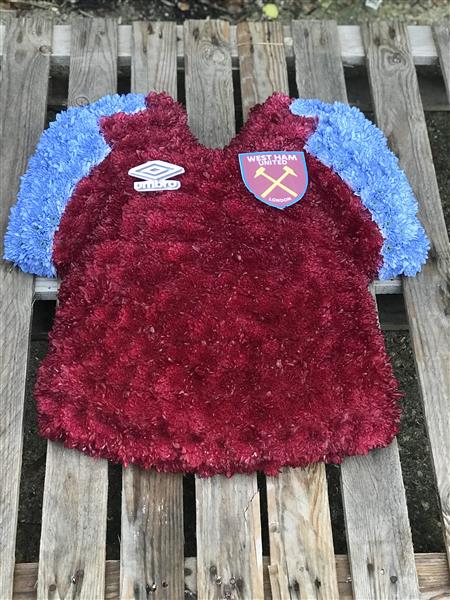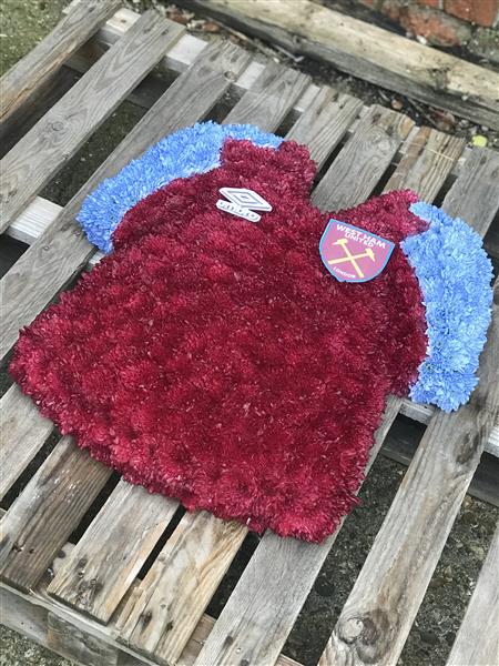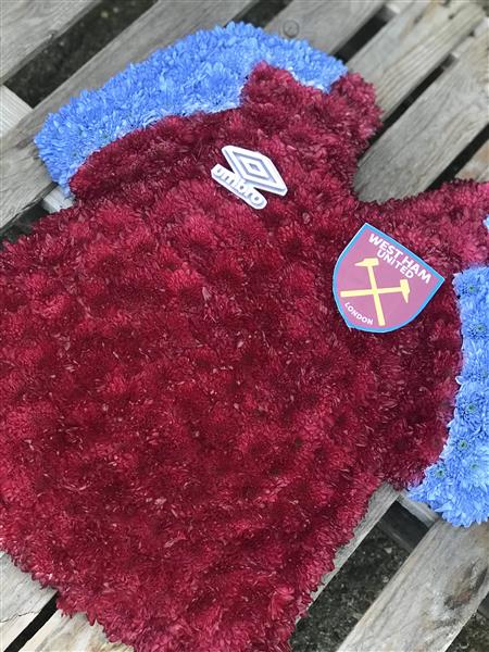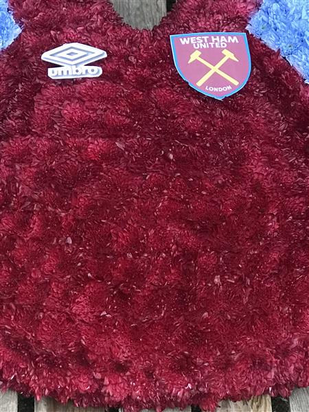A West Ham United (The Hammers) home football shirt. The famous claret and blue colours of 'The Irons' are recreated in flowers for a special funeral flowers tribute.