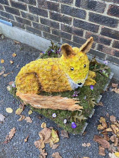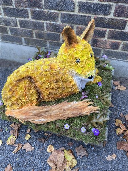 Introducing the Fox Funeral Flowers Tribute – a stunning tribute designed to honour your loved one in a truly unique way. This exquisite arrangement features a meticulously crafted 3D fox, elegantly resting in a vibrant meadow of fresh flowers and lush plant materials.