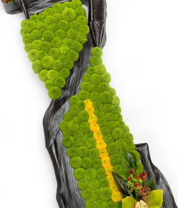 A green Cymbidium Orchid and Chyrsanthemum golf bag tribute with yellow spray Chrysanthemum and bronze Hypericum detailing. A white Viburnum flourish with Bear Grass, soft Ruscus and Salal completes the design.