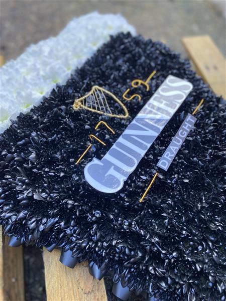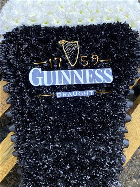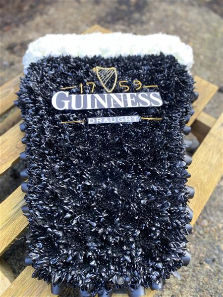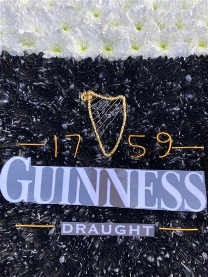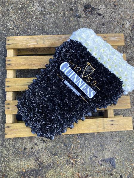 Celebrate cherished memories with this Guinness pint glass funeral tribute, a thoughtful way to reflect personality and individuality. Designed by expert florists with fresh flowers, this bespoke arrangement offers a meaningful and memorable farewell. Ideal for honouring a loved one’s passions, this floral tribute is carefully crafted with detail. Rays Florist delivers locally across most GU postcodes.