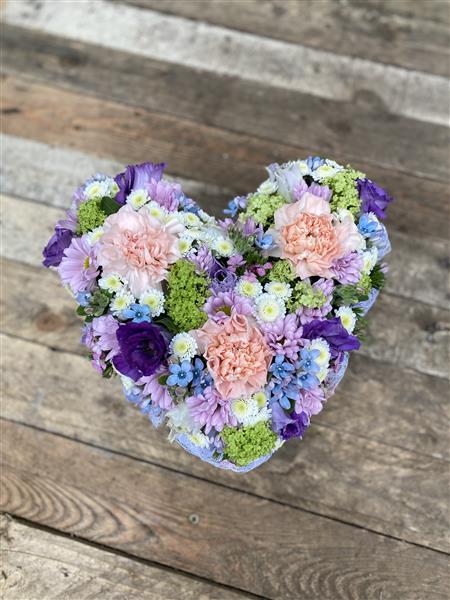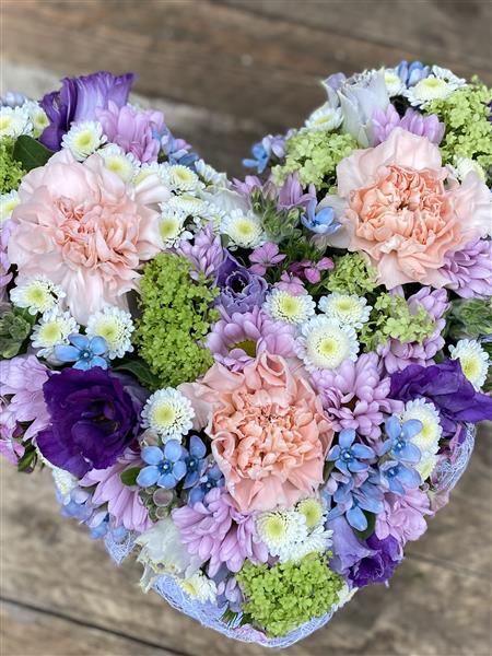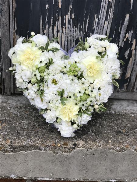 A floral heart in a 'loose' style meaning that we use a variety of more dainty and delicate flowers. Choose your colour option below so that we can create your funeral flowers in the shades you require.