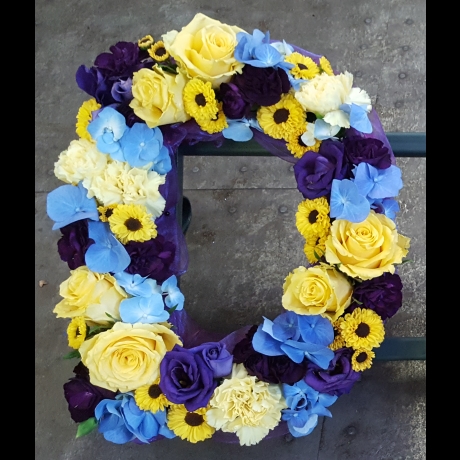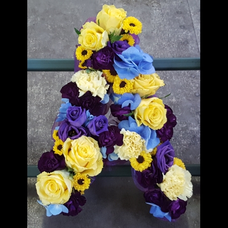 Honour a loved one with our Loose Letter Blues and Lemon floral tribute, featuring vibrant blue and yellow blooms. Customisable to spell any name or word, this tribute offers a personal touch to memorial services. Crafted with care, it provides a meaningful way to express your sentiments. Rays Florist delivers locally in most GU postcodes, ensuring timely and respectful service.