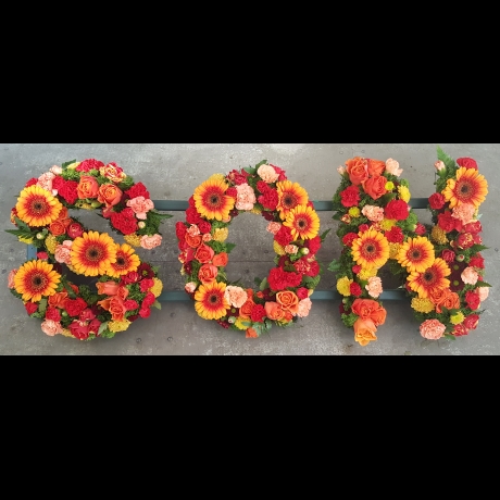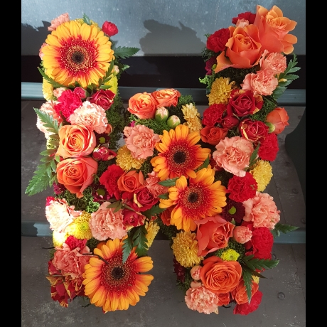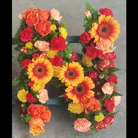 Honour your loved one with our Loose Letter Rich Autumnal Colours tribute. Featuring warm autumnal blooms, this arrangement is handcrafted to spell any name, adding a unique personal touch to memorial services. Rays Florist offers reliable local delivery in most GU postcodes, ensuring your tribute arrives fresh and beautifully arranged for the occasion.