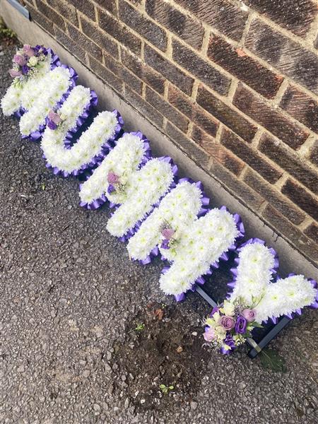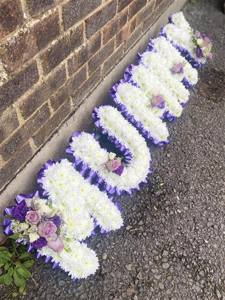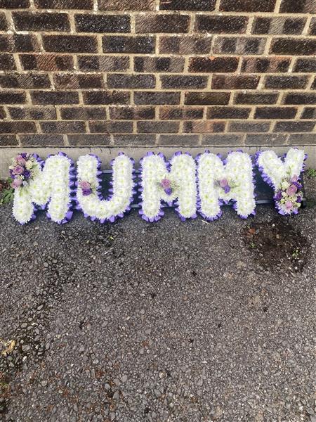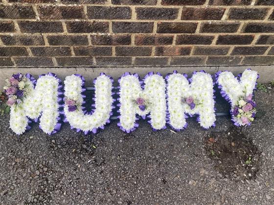 Express your deepest love and sympathy with this beautiful "Mummy" funeral flower tribute. Crafted with elegant white blooms, this dignified and heartfelt arrangement is a touching final gift to honour a beloved mother. The design offers a personal and comforting touch for the funeral service. Rays Florist provides compassionate same-day delivery for this and all our funeral flowers across most GU postcode areas. Order online for reliable local service.