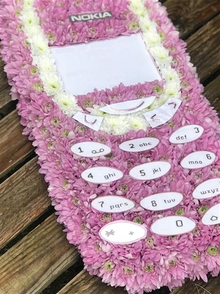 Funeral flowers tribute in the shape of an old style Nokia mobile phone. Fully bespoke floral tribute with Nokia badging, LED style display and number buttons. The phone colour can be changed if not suitable, so please call us to discuss your options.